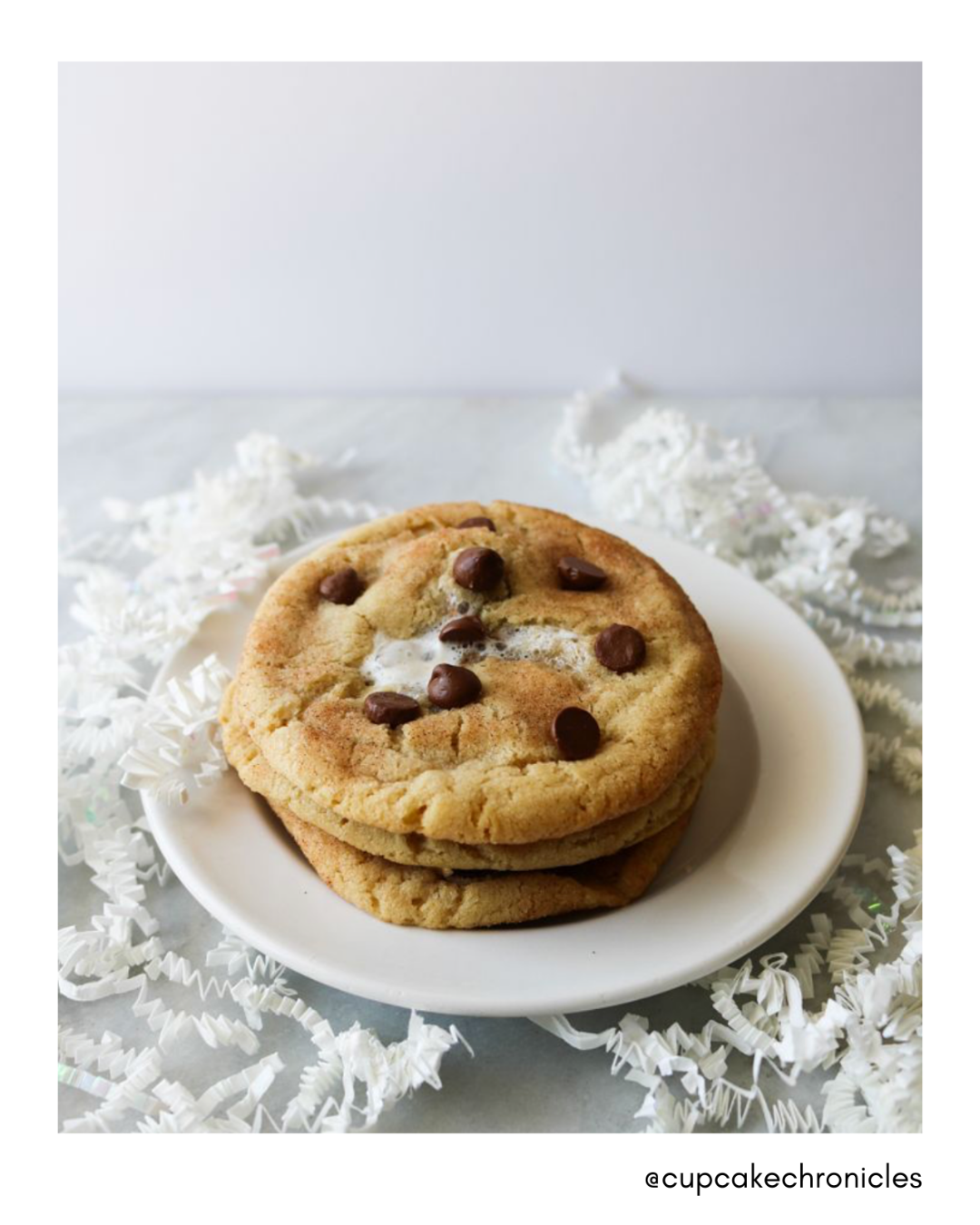 Snickerdoodle cookies with mini chocolate chips, chocolate hazelnut spread, graham cracker pieces, and melted marshmallows. Crispy on the outside, soft and chewy on the inside: just how cookies should be.
